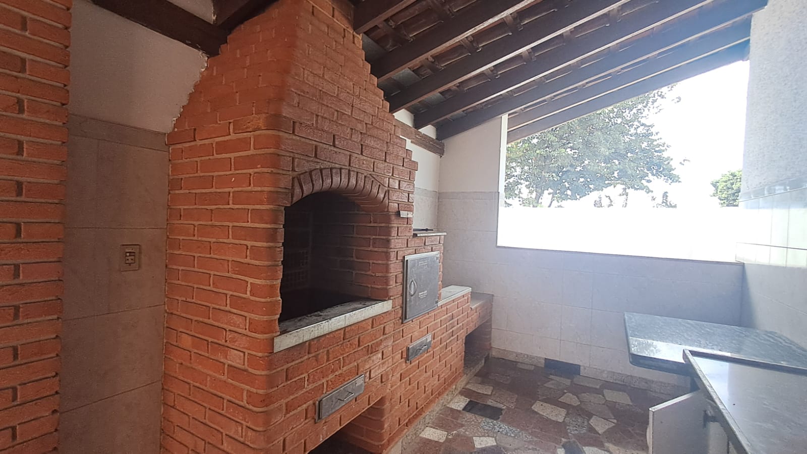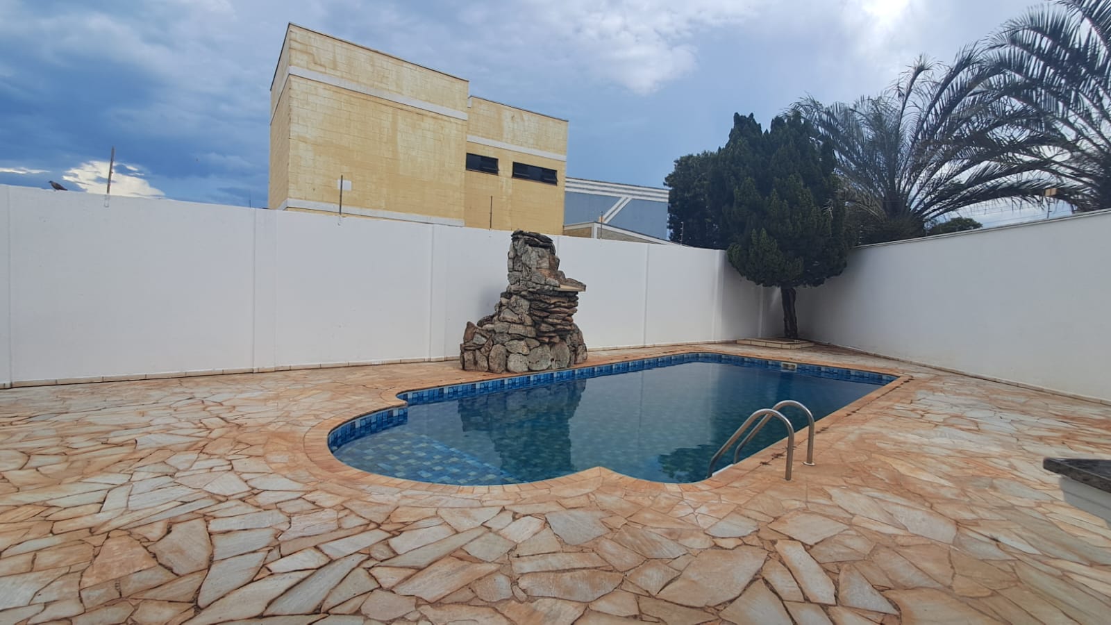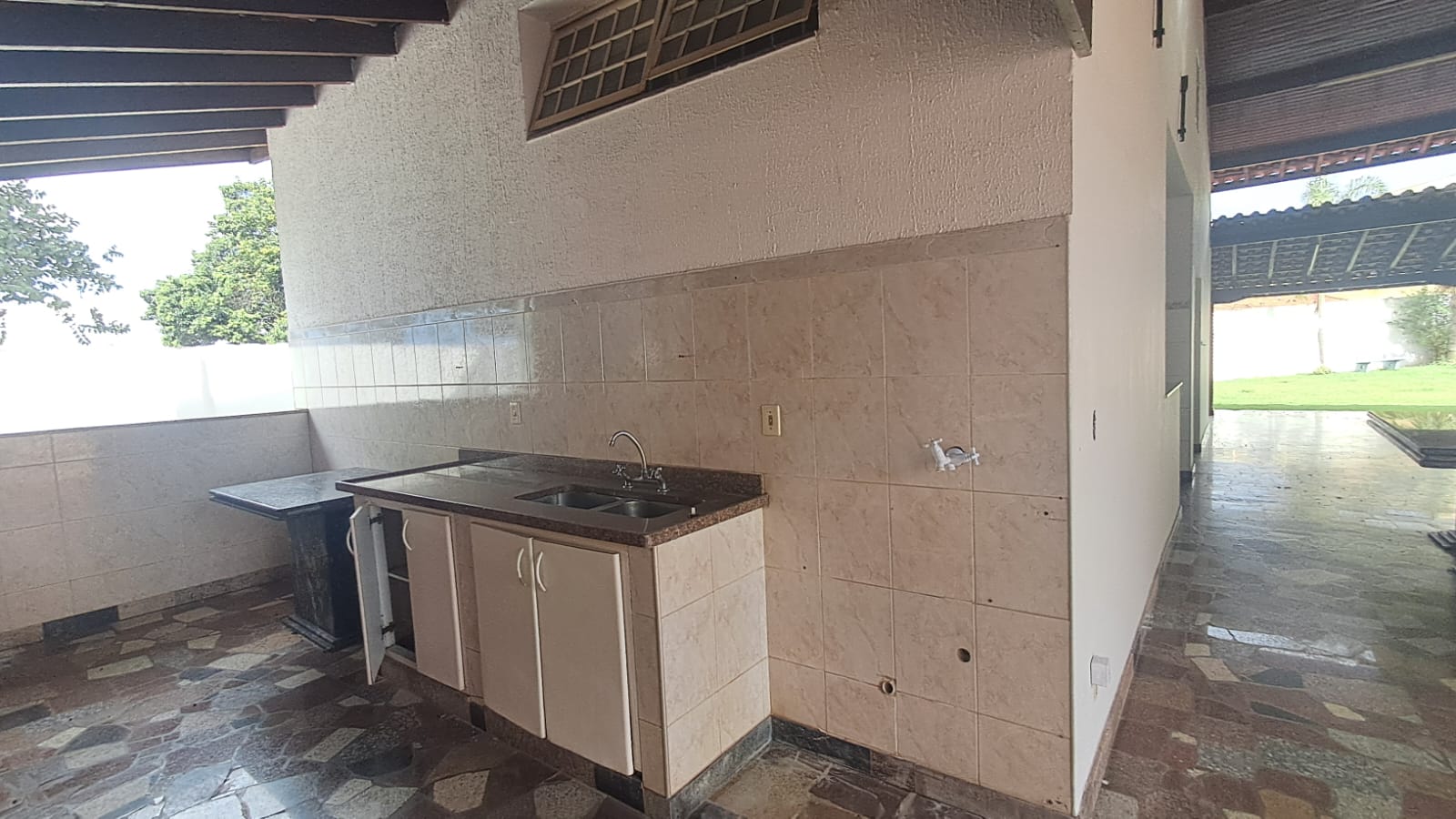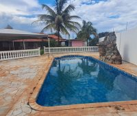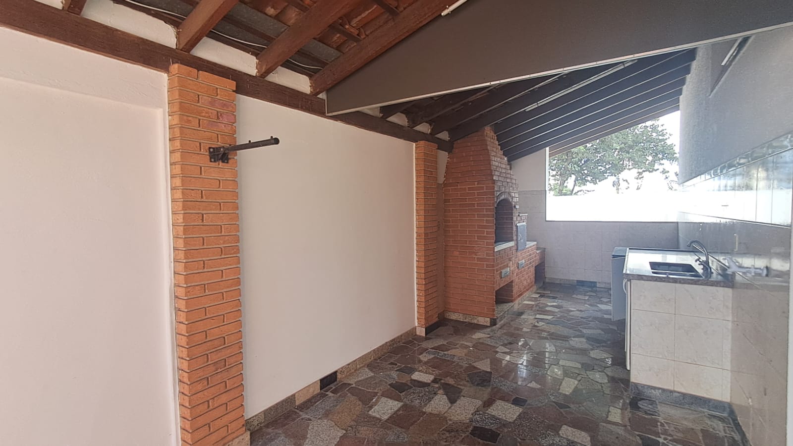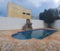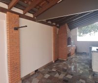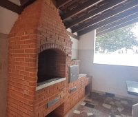 Nos fundos, churrasqueira e piscina.