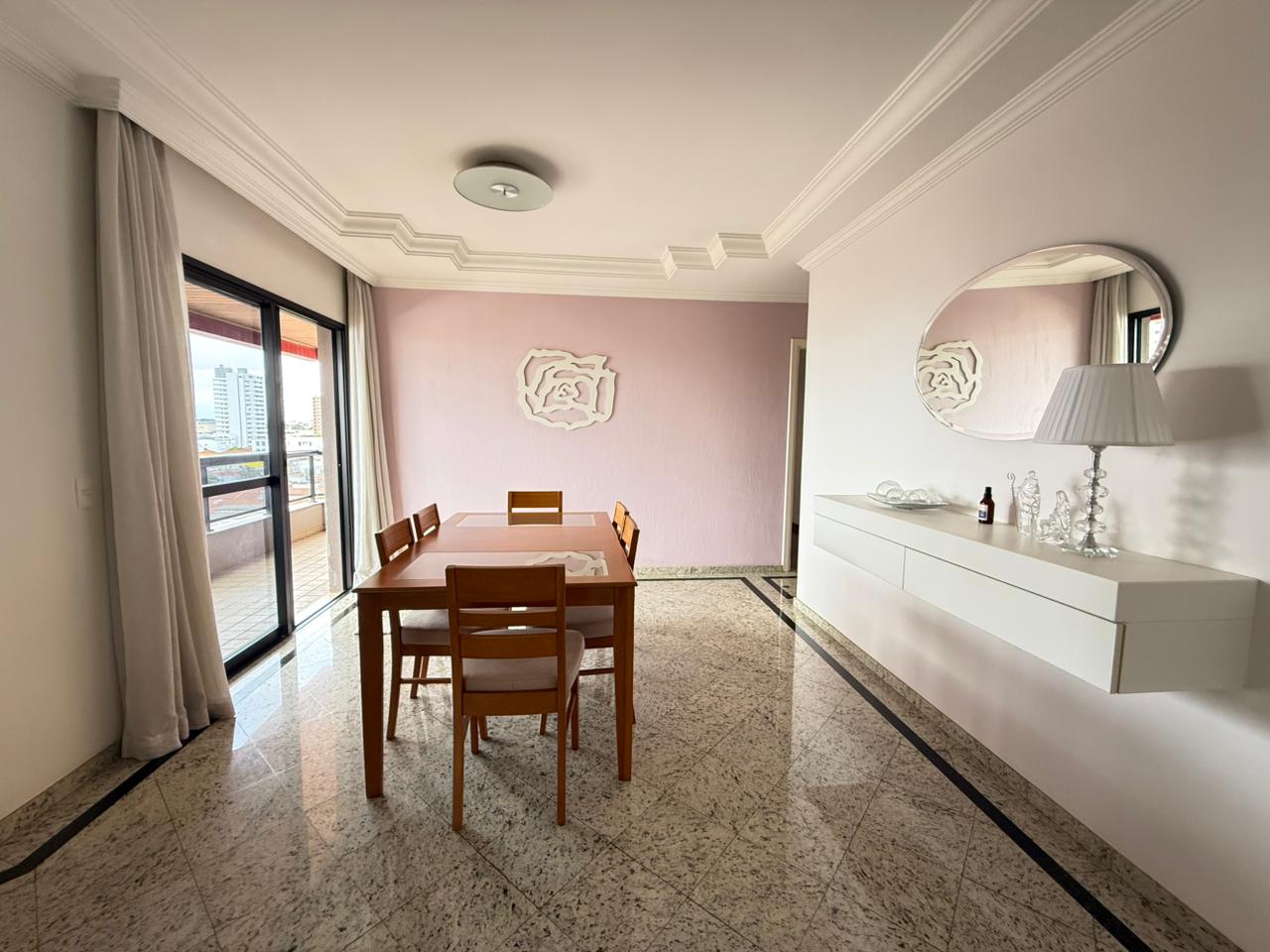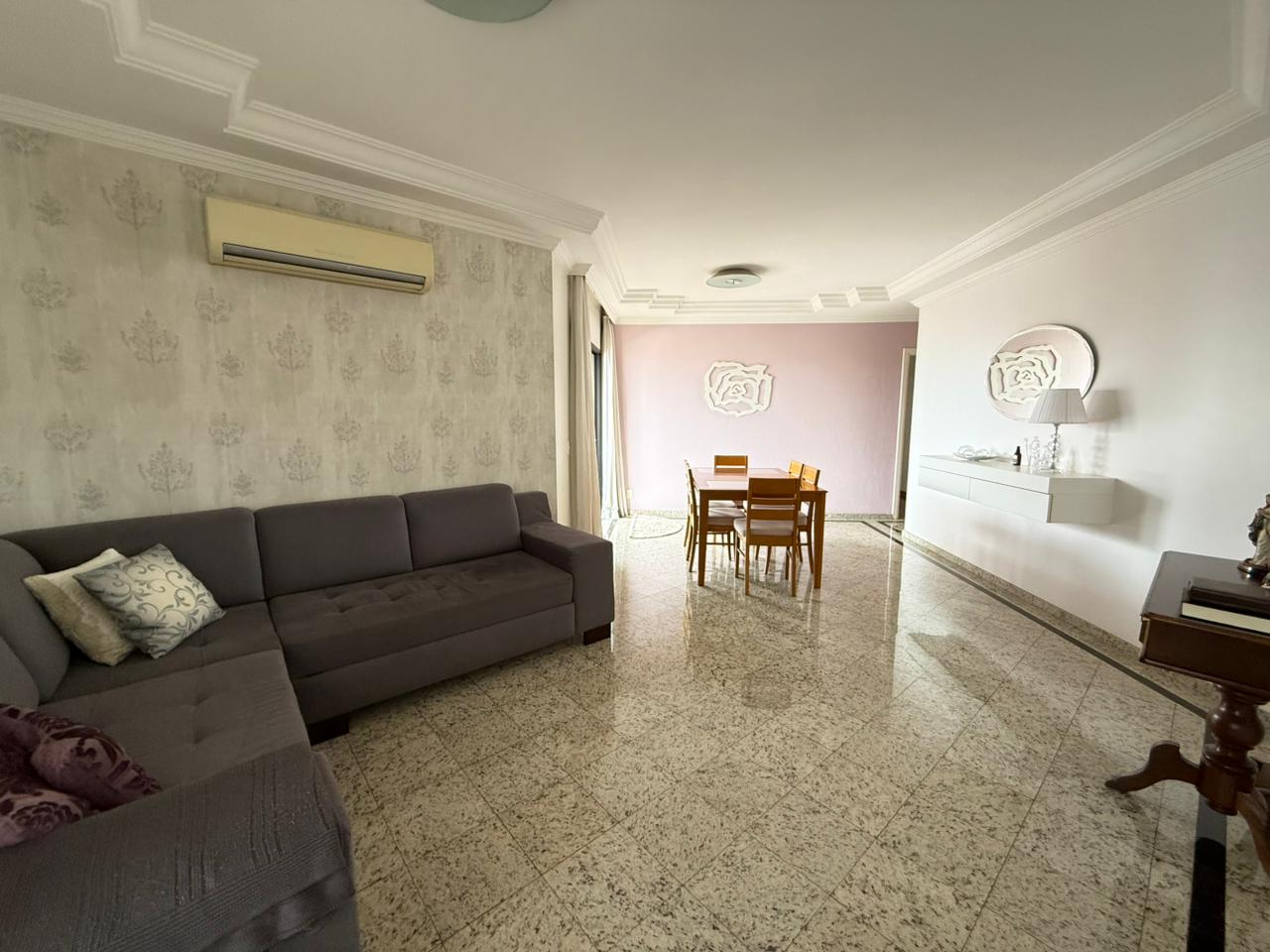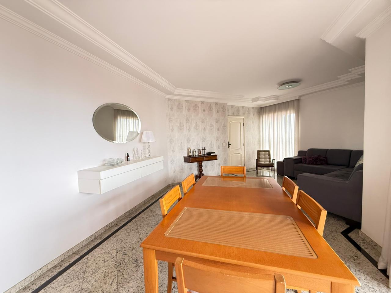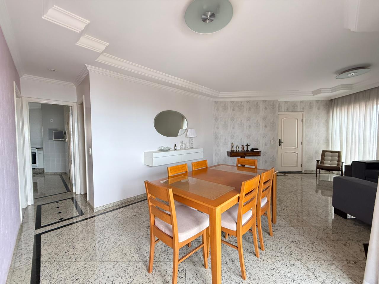 O imóvel conta com ampla sala de estar integrada à sala de jantar, totalmente reformada, além de sacada com vista panorâmica da cidade e um elegante lavabo que complementa o ambiente.